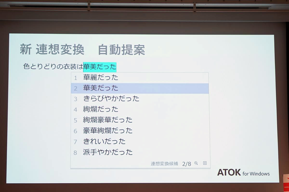 また、新ATOKには文章表現に悩んでいる人にぴったりな、類語を一覧で表示する機能が追加されています。たとえば「この花は美しかった」という文章を読み返して、「この花は華やかだった」という文章に書き換えたとき、その機能が有効になります。ATOKのエンジンが「言い回しに悩んでいる」と判断して、「華やかだった」「きらびやかだった」といった類語の候補をいくつも提案します。ボキャブラリーに悩んでいる小説執筆者や編集者にはありがたい機能ですね。