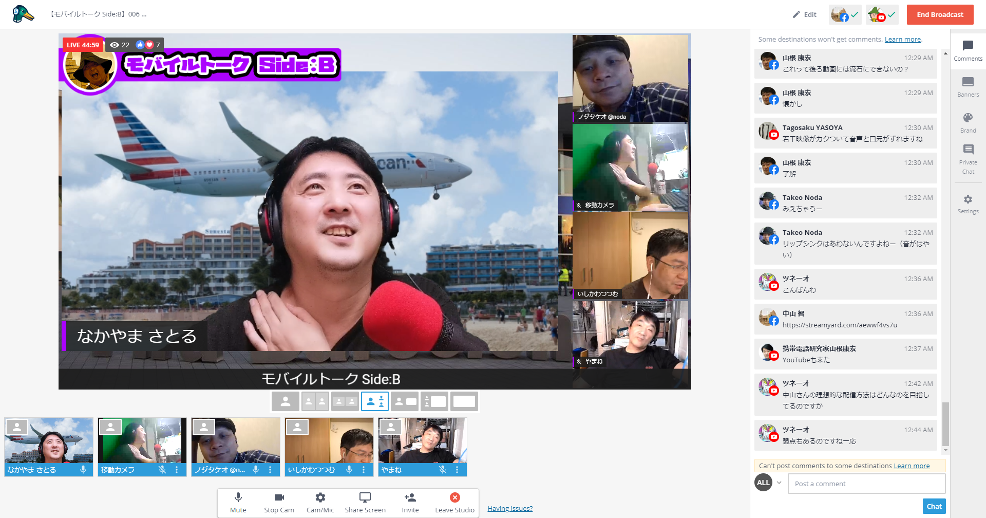 一方StreamYardでの配信は、YouTubeのアカウントと連携してコメントを拾ってくることができるので、StreamYardの配信画面だけ開いていればオーケー。しかもゲストとして参加しているユーザーも確認できるようになっています。