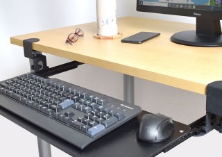 耐荷重約5gで、スライド式のため使わないときは収納可能。キーボードを机の上に置く必要が無くなるので、机のスペースを広く空けられる。また、ディスプレイと適切な距離を保つことが可能となり、背筋が伸びた姿勢で作業できる。