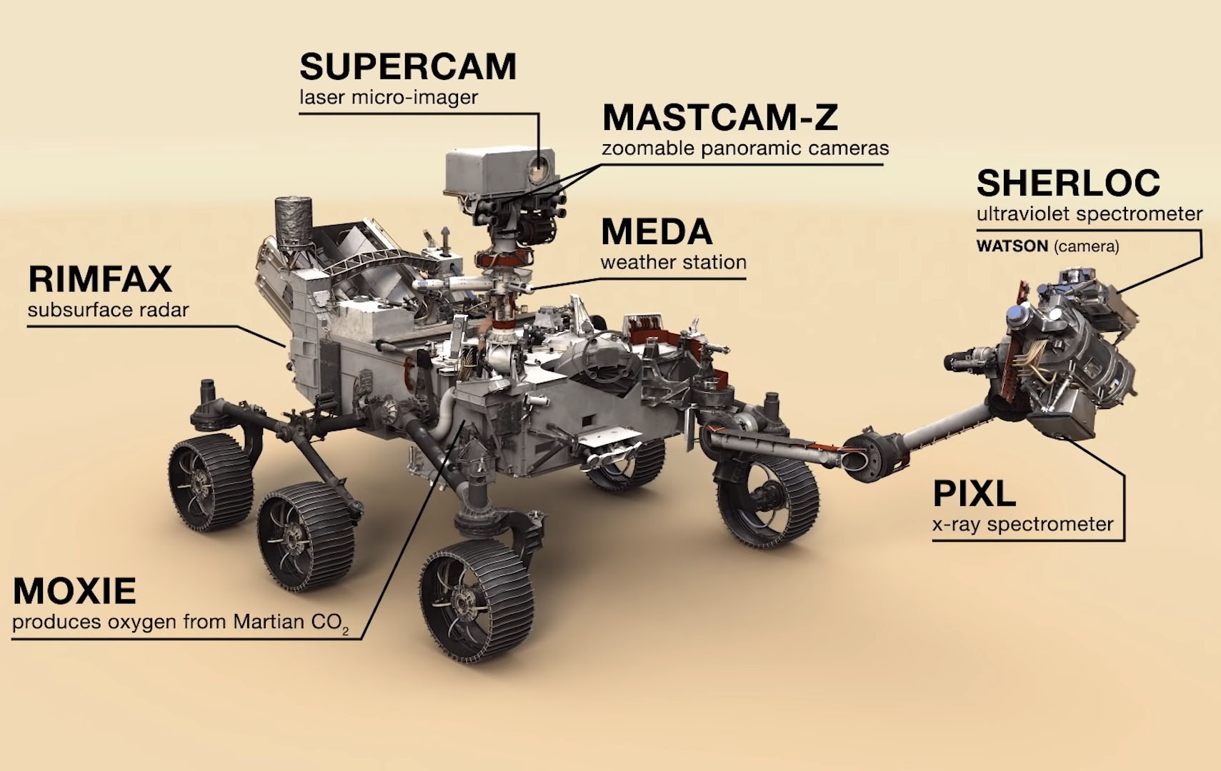 まず最初の「PIXL」はローバー前方に伸びるアーム先端に装備されたX線分光計で、地表面のサンプルの組成を分析します。