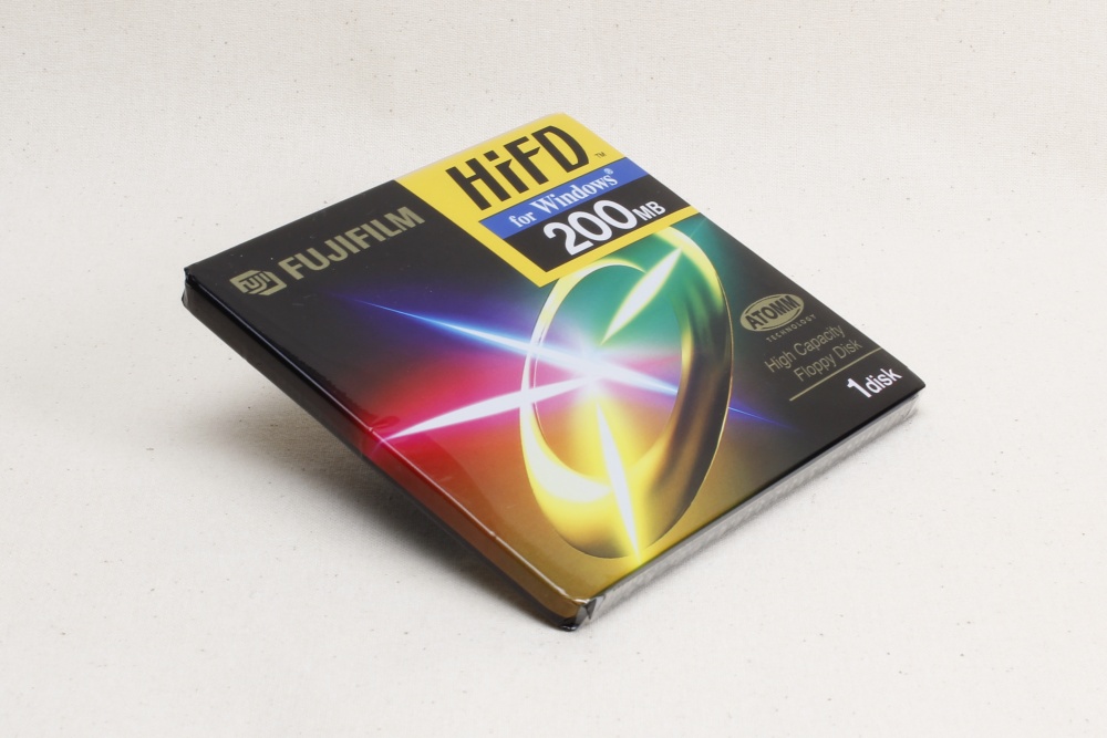 「HiFD」は、ソニーと富士フイルムによって開発された磁気ディスク。数ある次世代フロッピーディスク(以下、FD)のひとつです。Zipの100MBやSuperDiskの120MBと比べ2倍近くとなる200MBという容量、そして3.6MB/sという高速アクセス(Zipは1.4MB/s、SuperDiskは500KB/s程度)、さらに従来のFDも利用できる互換性の高いドライブを武器にのし上がり……たかったのだと思います。
