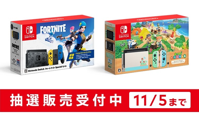 マイニンテンドーストアは、ゲーム機「Nintendo Switch:フォートナイトSpecialセット」と「Nintendo Switch あつまれ どうぶつの森セット」の抽選受付を開始しました。