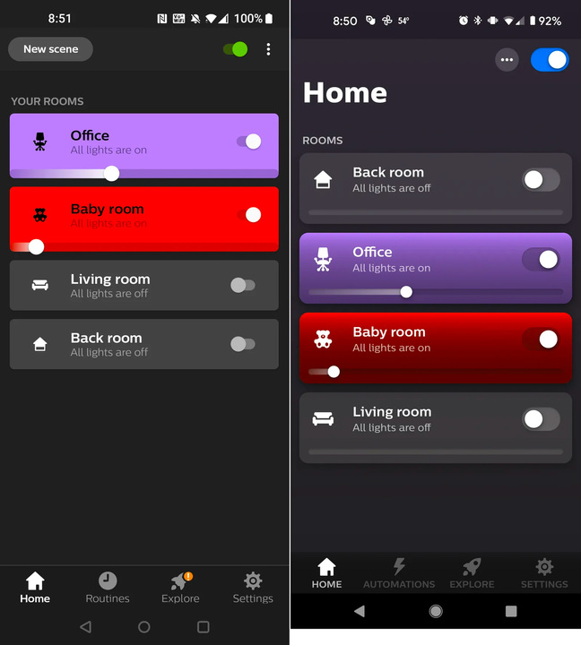 部屋をタップしてみると、さらに違いがわかります。Hueアプリでは、あらかじめ設定したシーンに素早くアクセス、自分でシーンを追加しカスタマイズできる、新しいタイルインターフェースが採用されています。Hueのシーンギャラリーはもともと存在していましたが、少しごちゃっとしていました。第4世代のバージョンでは、整理され操作しやすくなりました。