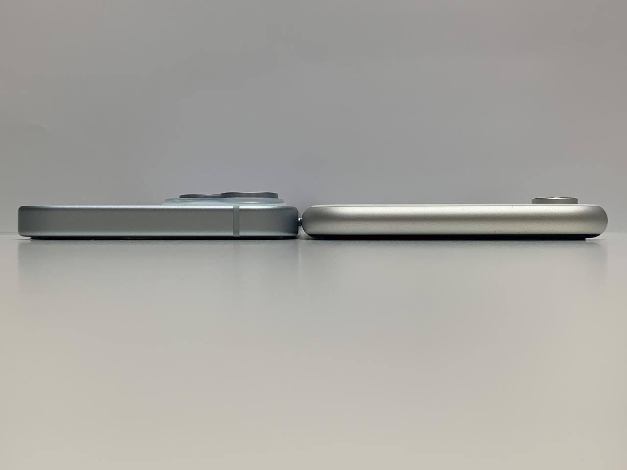 左がiPhone15、右がiPhoneXR。端末を水平面に置き、本体の上方から撮影したもの。iPhone15のレンズ部分の方が厚みがあることがわかる。