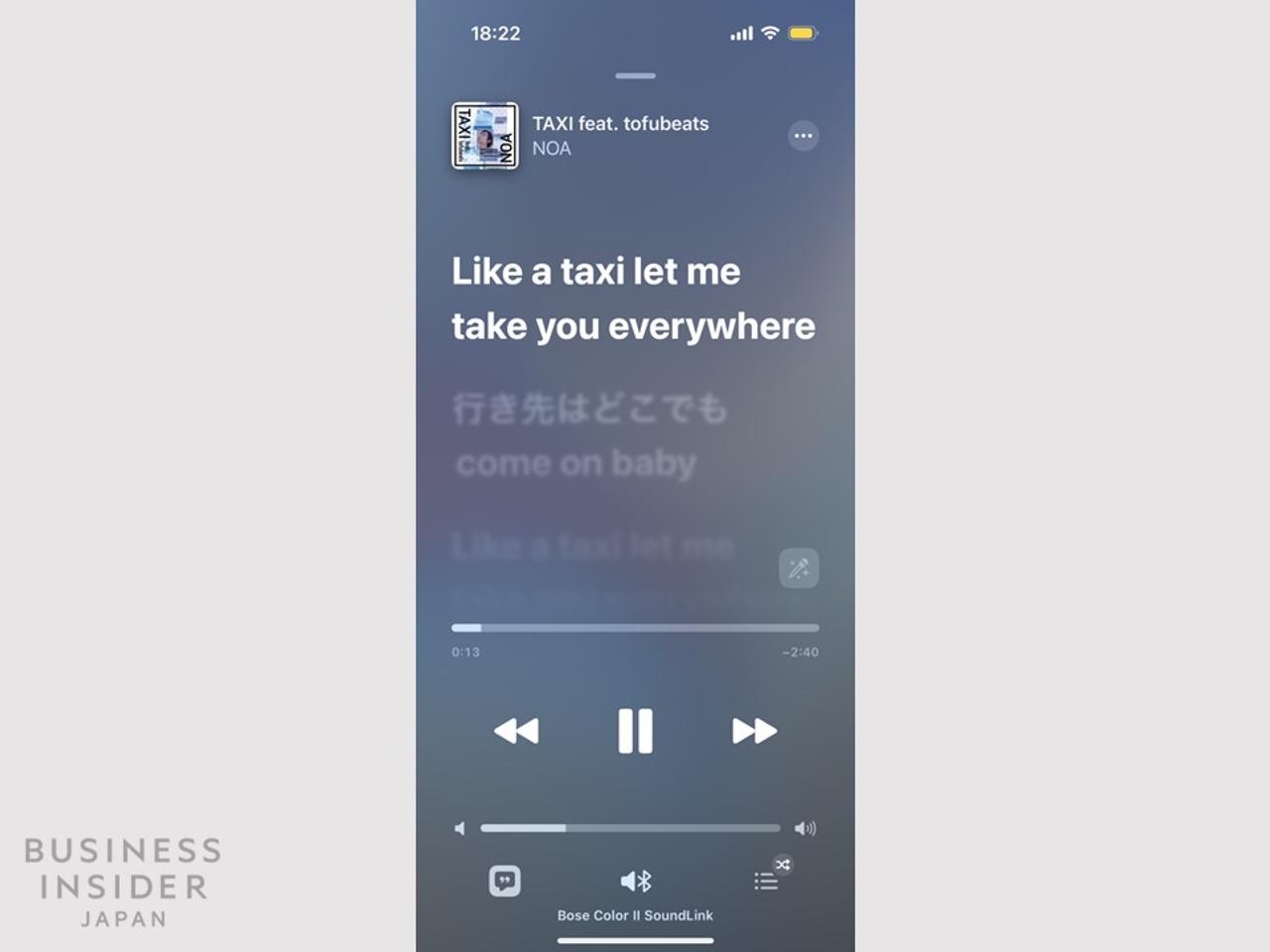 音楽再生中にダイナミックアイランドをタップすると、ミュージックアプリの再生画面を表示できます。これは他のアプリを使用中でもすぐに開けるので地味ながら便利。曲によっては歌詞をチェックするのにも役立ちます。
