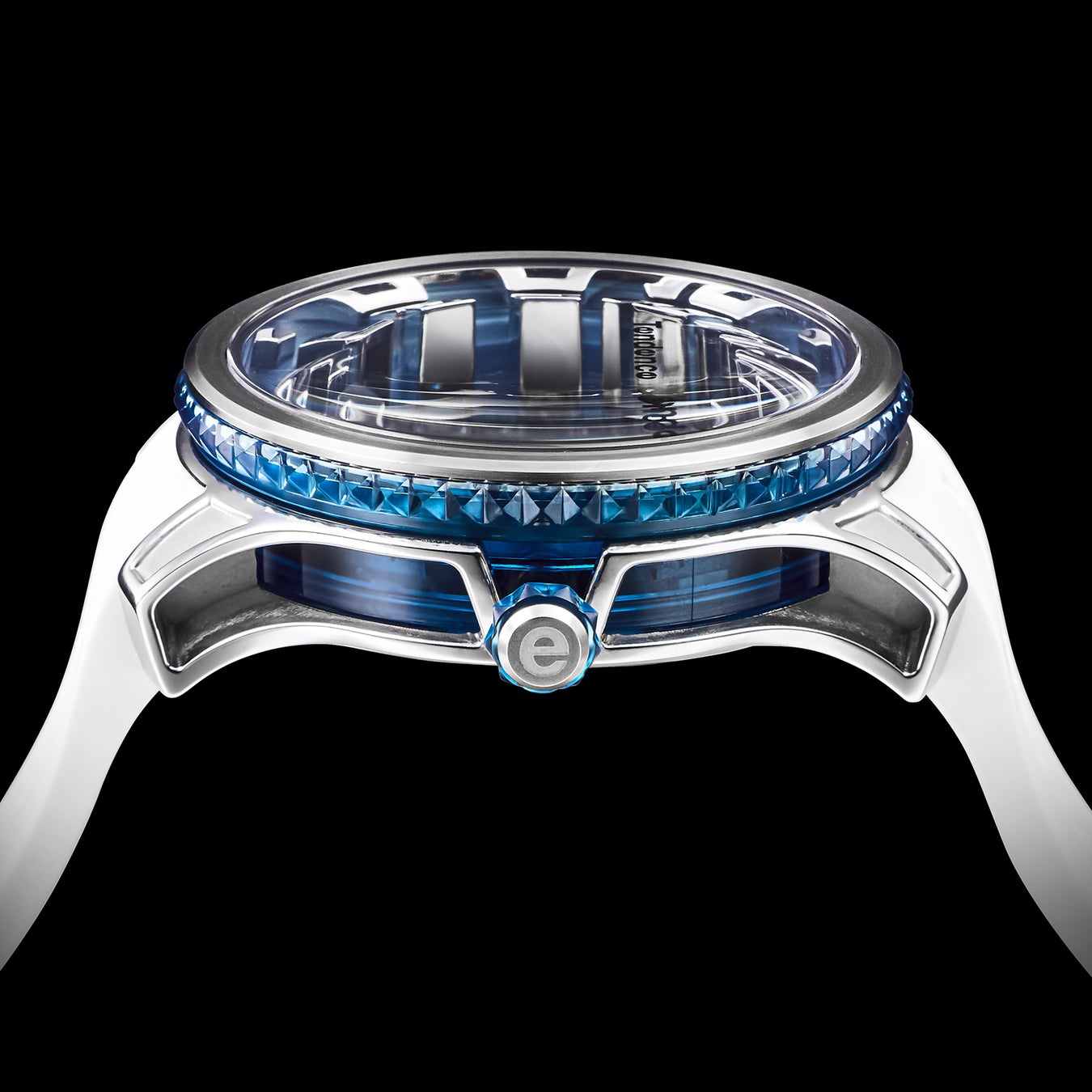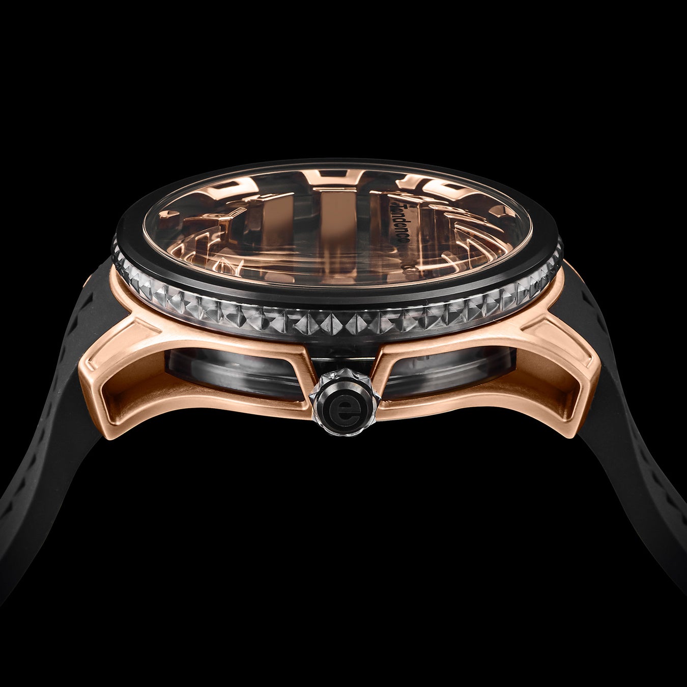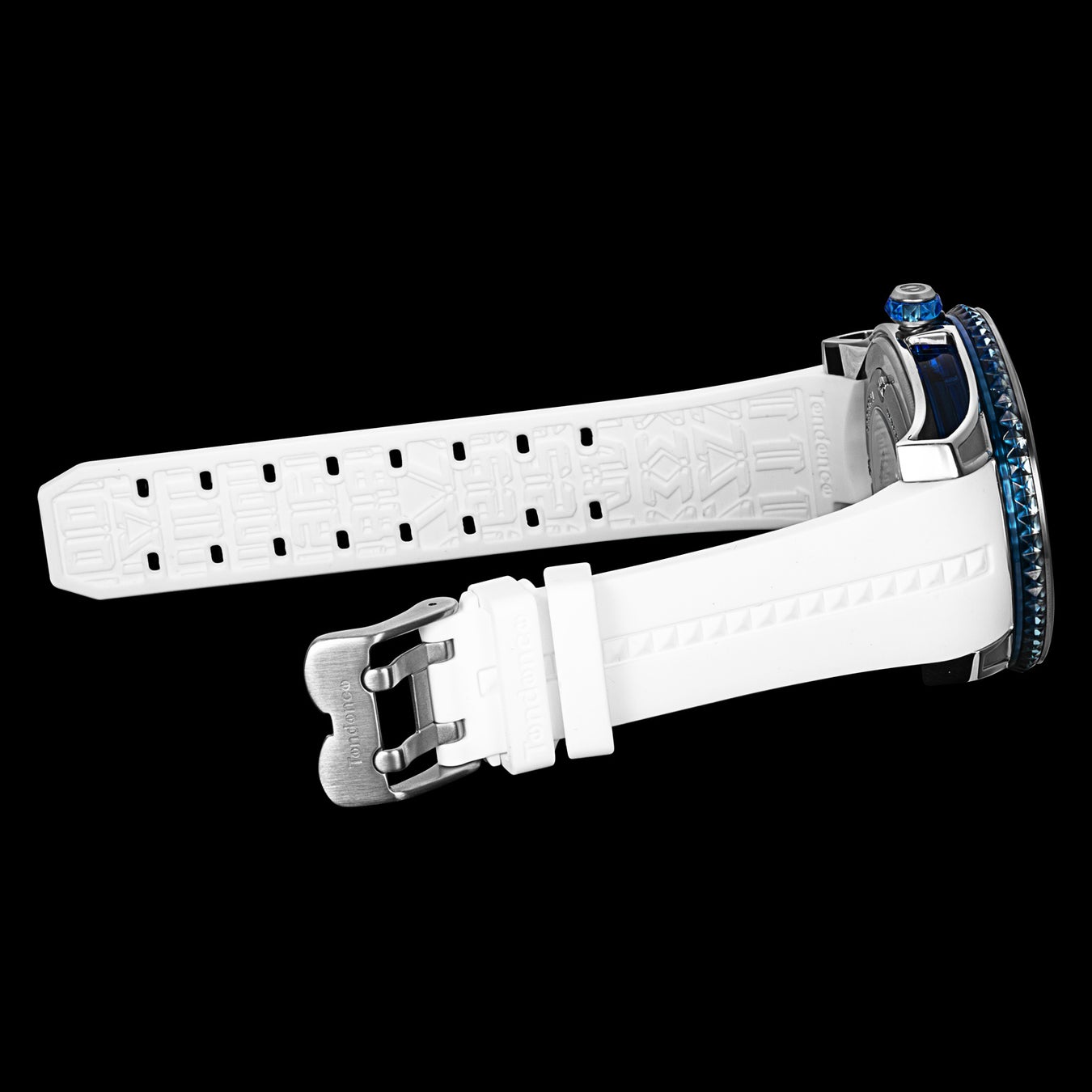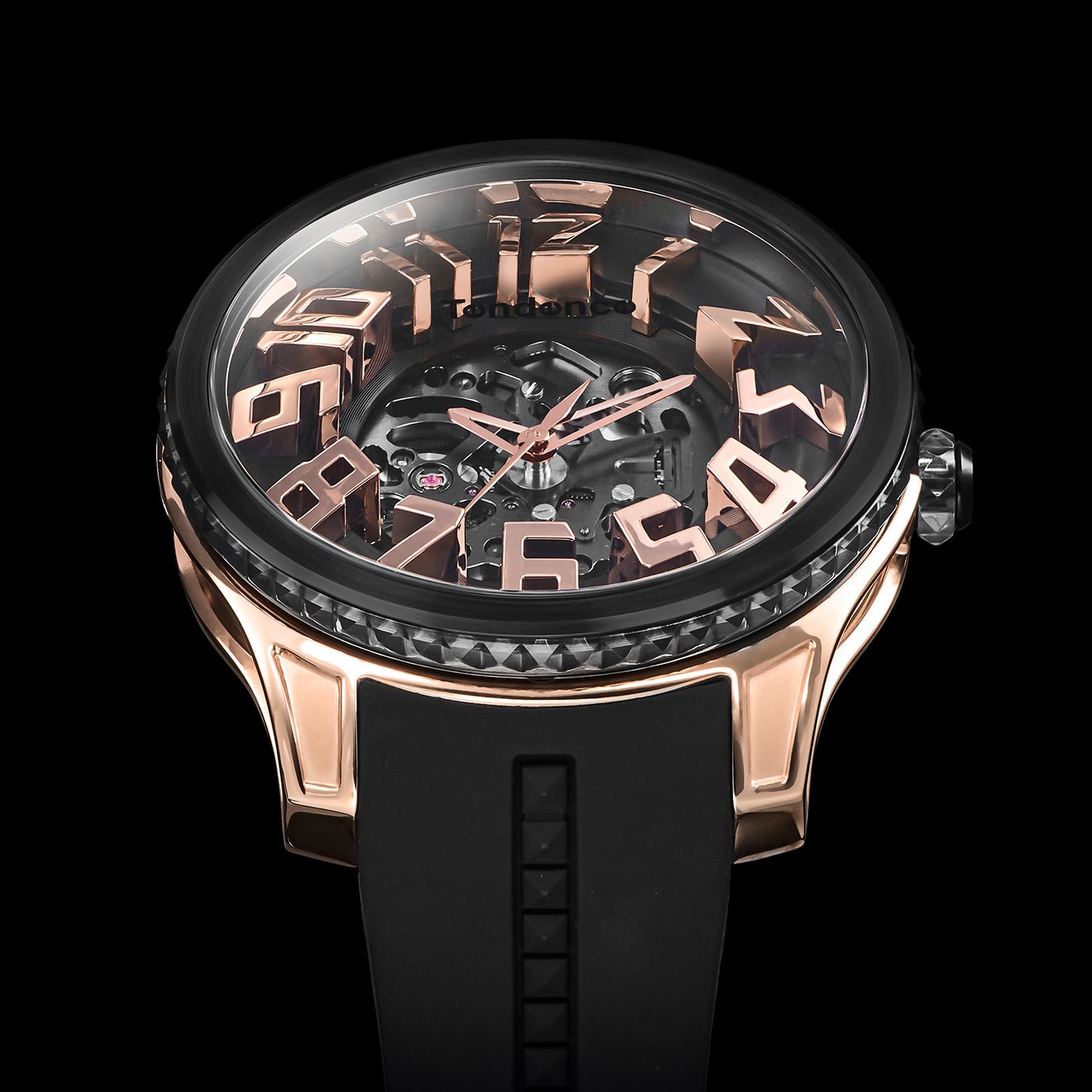 「Tendence(テンデンス)」が追い求めてきた圧倒的なインパクトや驚きのあるデザインは、そのほかのケース造形にも見られます。 ステンレススチール製ケースは、オーバーサイズのダイヤルを力強く支えながら、サイドを大胆に肉抜きすることで洗練や遊び心を演出。さらにムーブメントを囲うナイロンケースは内部が透けて見えるシースルー仕様であるとともに、ピラミッド型スタッズのラインも形成され、ラグジュアリーな雰囲気を醸成します。
