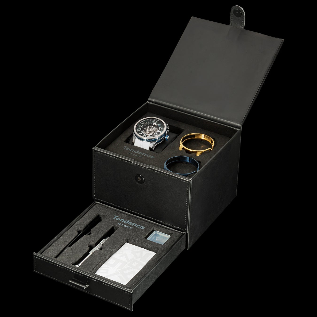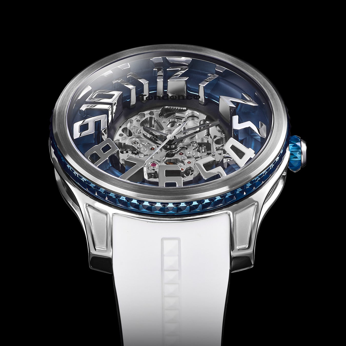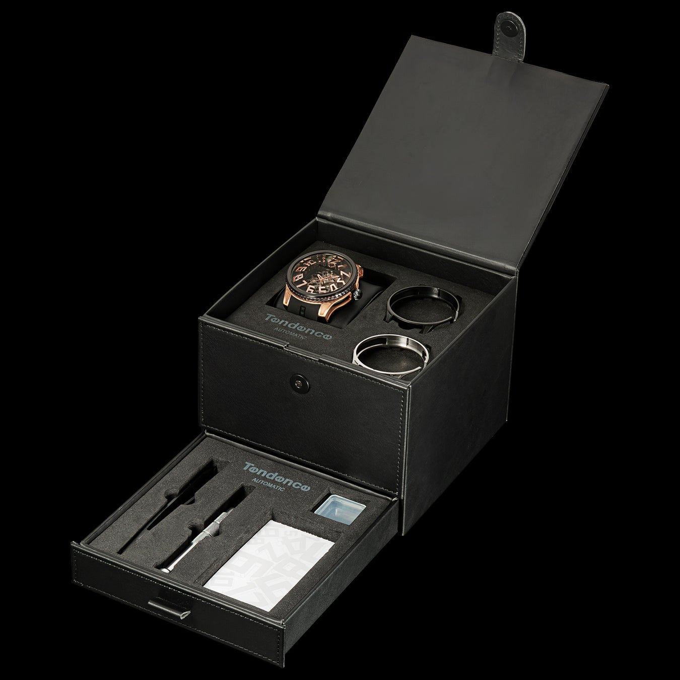 「Tendence(テンデンス)」が追い求めてきた圧倒的なインパクトや驚きのあるデザインは、そのほかのケース造形にも見られます。 ステンレススチール製ケースは、オーバーサイズのダイヤルを力強く支えながら、サイドを大胆に肉抜きすることで洗練や遊び心を演出。さらにムーブメントを囲うナイロンケースは内部が透けて見えるシースルー仕様であるとともに、ピラミッド型スタッズのラインも形成され、ラグジュアリーな雰囲気を醸成します。