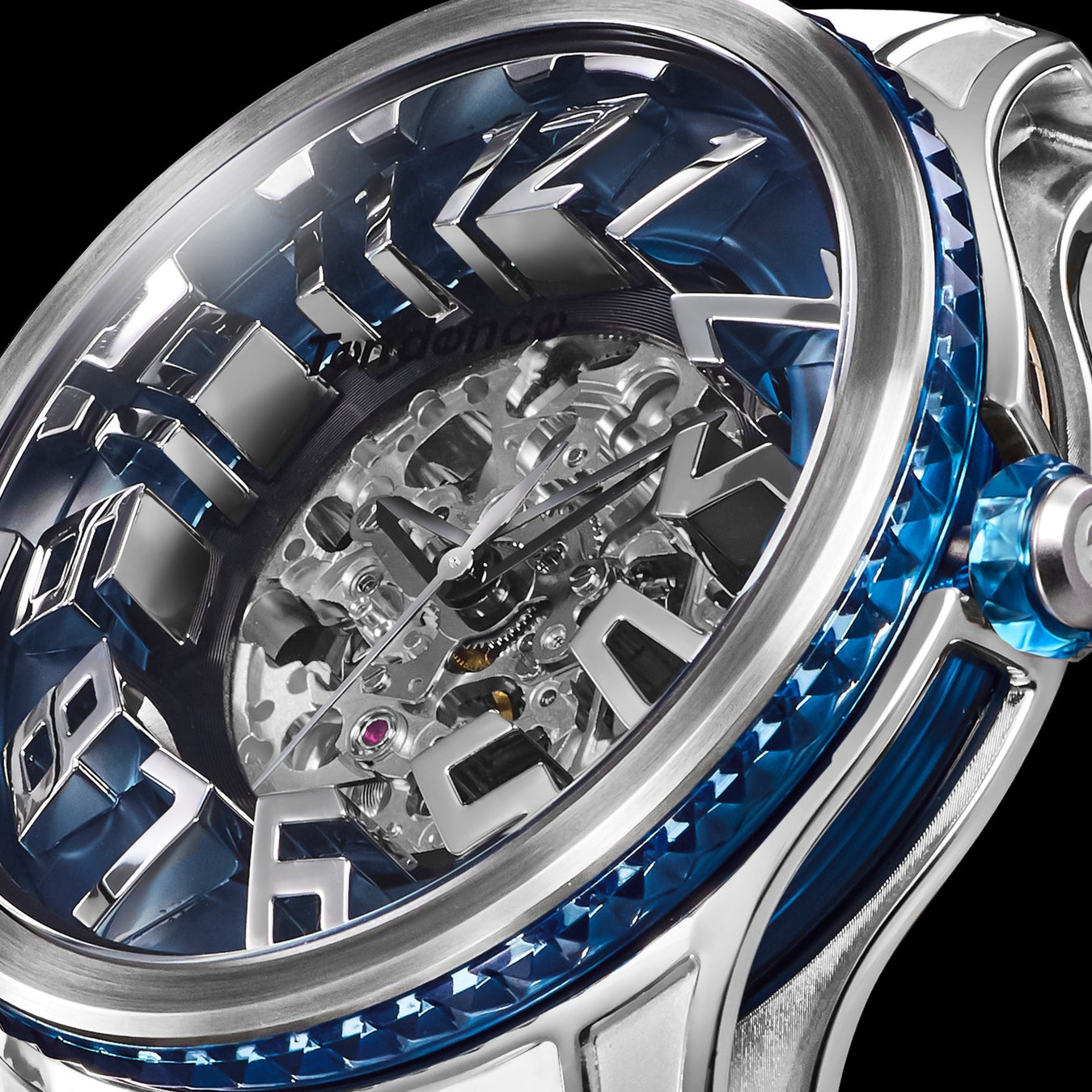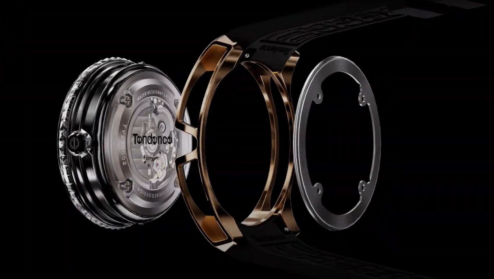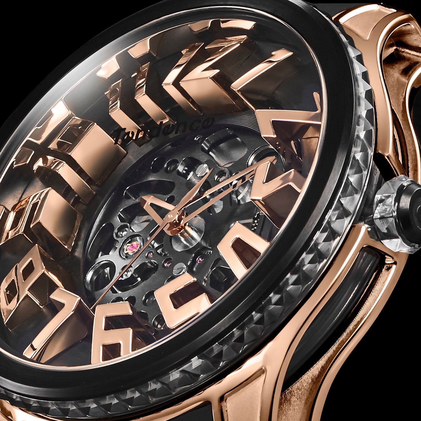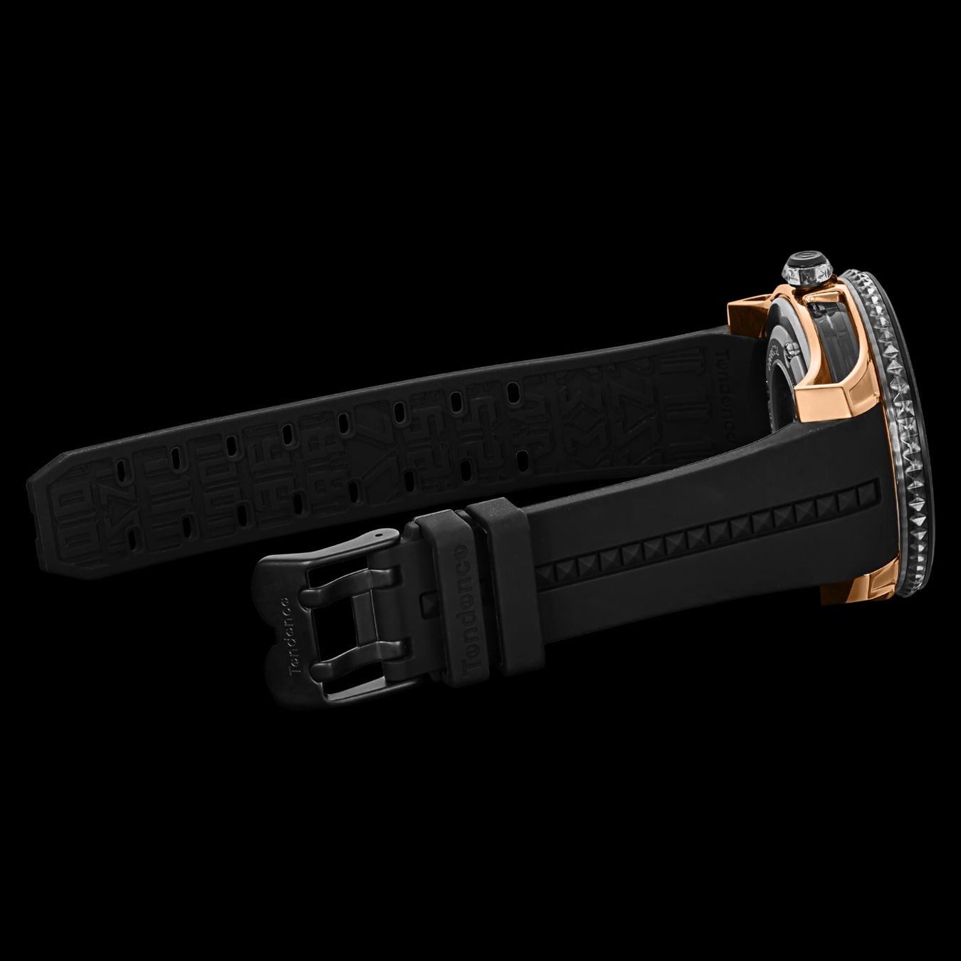 「Tendence(テンデンス)」が追い求めてきた圧倒的なインパクトや驚きのあるデザインは、そのほかのケース造形にも見られます。 ステンレススチール製ケースは、オーバーサイズのダイヤルを力強く支えながら、サイドを大胆に肉抜きすることで洗練や遊び心を演出。さらにムーブメントを囲うナイロンケースは内部が透けて見えるシースルー仕様であるとともに、ピラミッド型スタッズのラインも形成され、ラグジュアリーな雰囲気を醸成します。